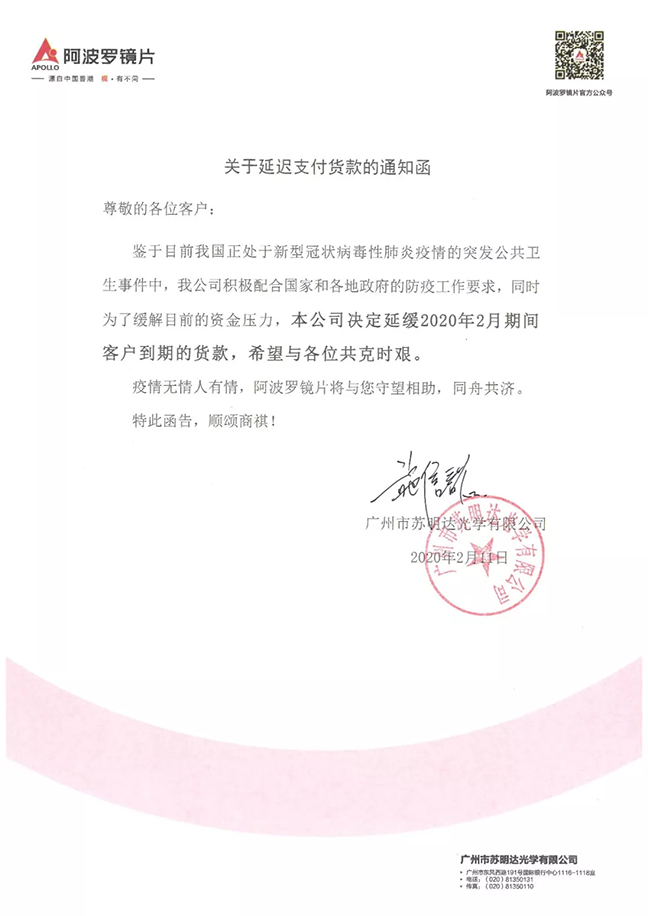 一场突发的公共卫生事件让全国各业陷入困境,对于大部分企业来说资金压力不容忽视,租金、人力无一不是固定支出,阿波罗镜片愿与各位合作伙伴共战疫境,并以实际行动支持,本公司决定:延缓2020年2月期间客户到期的货款,希望与各位共克时艰,守望相助,抱团度过短暂寒冬!