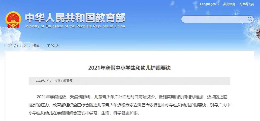 国家教育部发布2021年寒假中小学生和幼儿护眼要诀