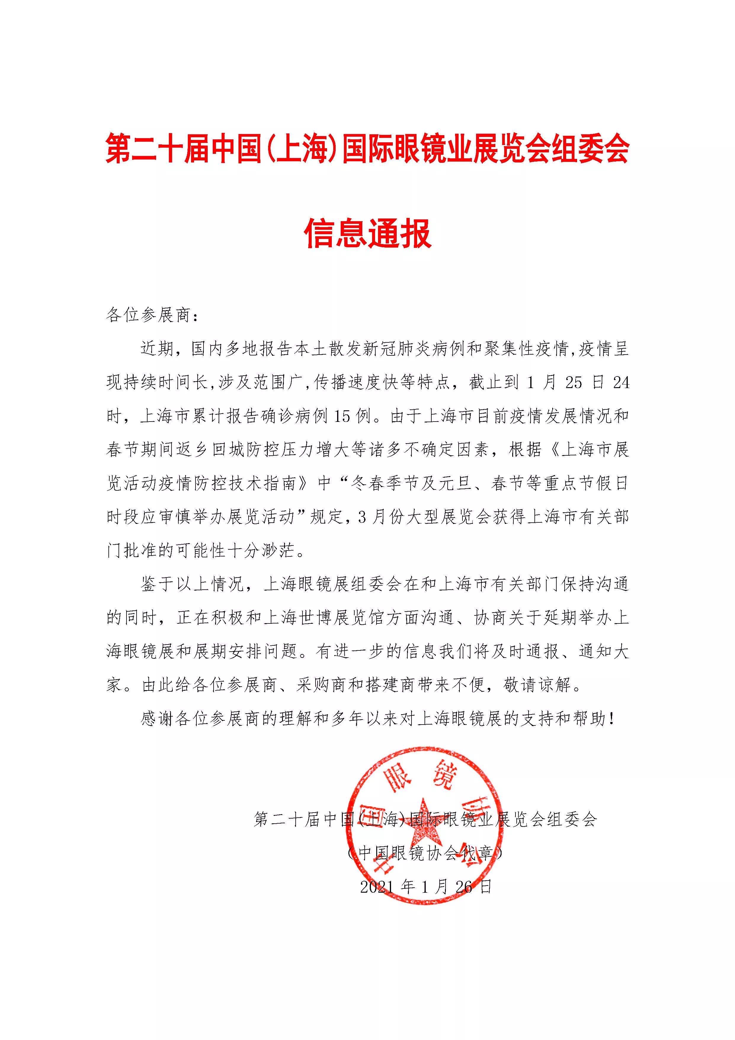 鉴于目前上海市疫情发展情况和春节返乡回城防控压力增大等诸多不确定因素,上海眼镜展举办及展期安排或将变动。上海眼镜展组委会正在多方沟通和协商,有进一步消息将作及时通报。