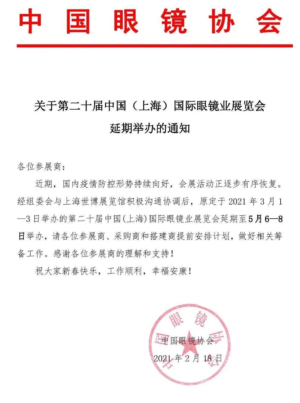 关于第二十届中国(上海)国际眼镜业展览会延期举办的通知