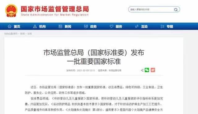 近日,国家市场监督管理总局(国家标准委)发布一批重要国家标准,涉及消费品、卫生防护等诸多领域。