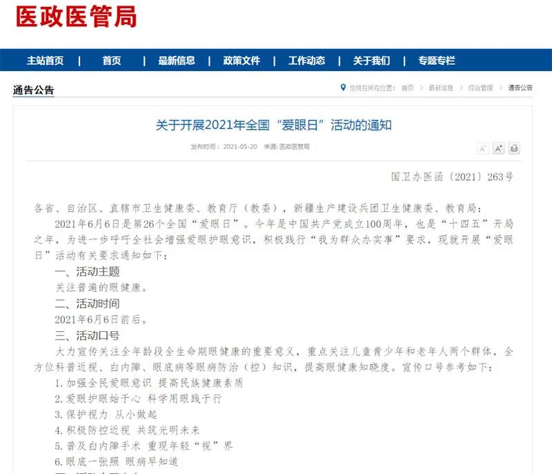 2021年6月6日是第26个全国“爱眼日”,今年爱眼日的主题是:关注普遍的眼健康。5月19日,国家卫生健康委办公厅和教育部办公厅联合发布《关于开展2021年全国“爱眼日”活动的通知》,进一步呼吁全社会行动起来,增强爱眼护眼意识