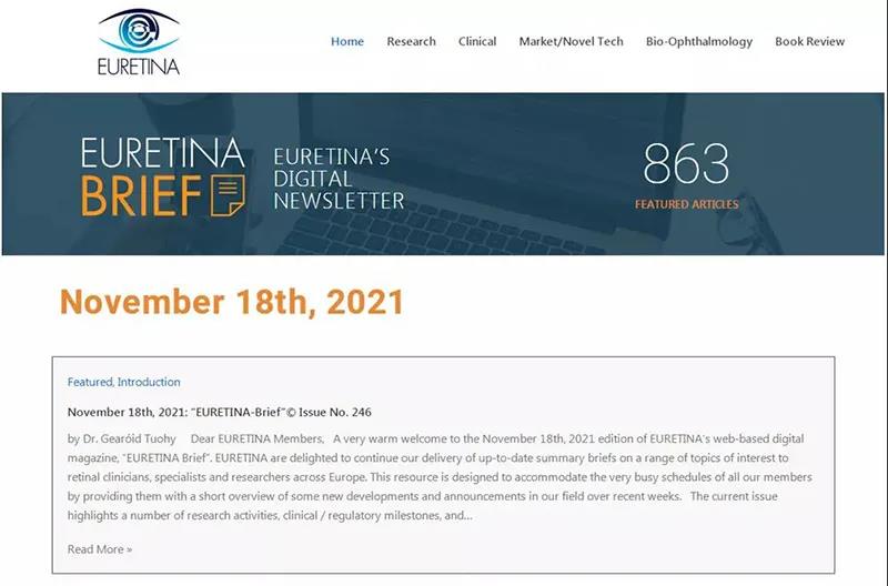 2021年11月18日,国际视网膜疾病权威学术组织欧洲视网膜专家学会(EURETINA)在其最新一期的新闻刊物《欧洲视网膜简报》(EURETINA BRIEF)中重点介绍了一项河南省人民医院有关遗传性视网膜变性的研究成果。欧洲视网膜专家学会由全球3500余名从事视网膜疾病诊疗和研究的医生、科学家和研究者组成。《欧洲视网膜简报》报道该领域最新的研究进展和相关公告。