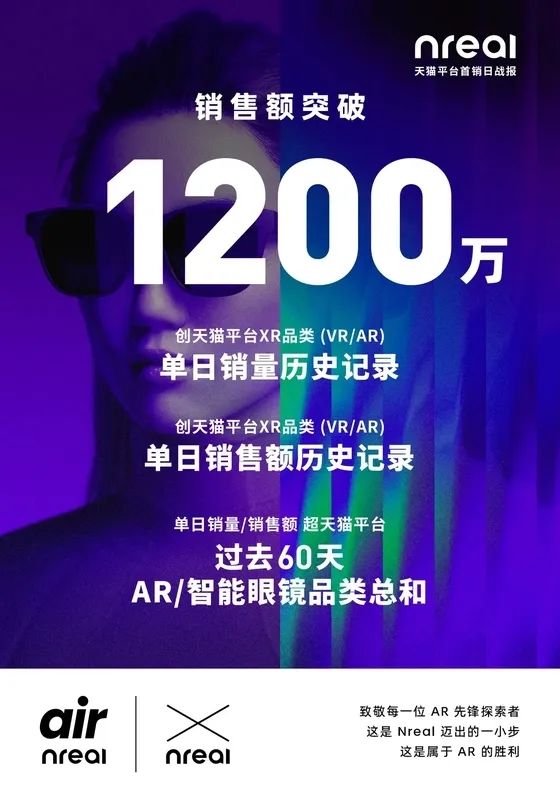 Nreal AR眼镜天猫单日销售额破1200万,创造AR眼镜品类新历史