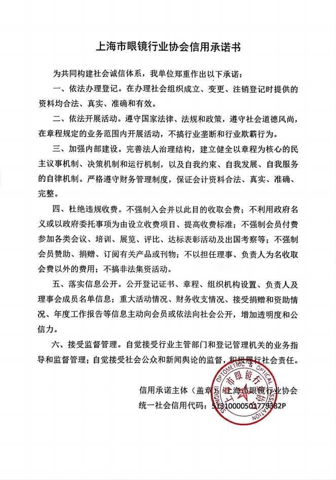 上海市眼镜行业协会信用承诺书